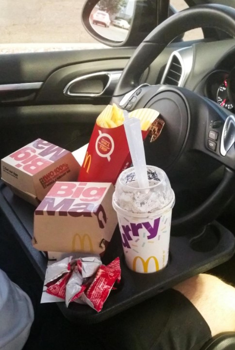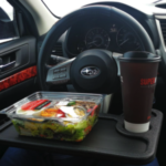 I love this tray! Where I work, days can get hectic to the point where I simply refuse to eat my lunch inside so I go to my car (mental breakaway). I have a sliding armrest/console but it got annoying trying to cut up my hibachi-style teriyaki chicken from Tokyo Grill on it. I did an internet search and found this! No regrets! Note: if you have a steering wheel cover on, this won’t work. Bright side: it’s easy to put on your steering wheel and yes you will doubt yourself and think you can’t apply pressure or you’ll drop your food and drink in your lap, lol.