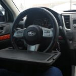 and the steering wheel doesn’t have to be turned upside down. This makes the occasional eating in the car much neater. This table, I got the large one, is sturdy and does require a seat adjustment. The flip side has a nice writing surface and a place to secure a pen or pencil. Happy with my purchase.