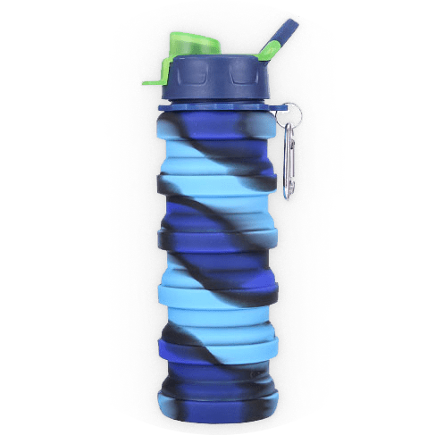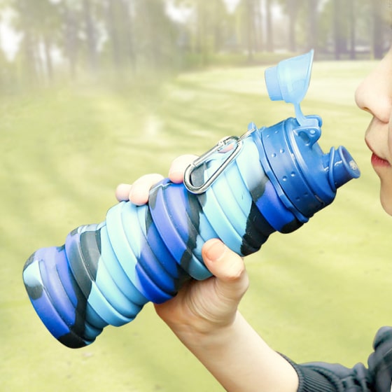 This foldable water bottle comes in a stylish camouflage blue color. Size when folded: 3.14” without lid, 5.5” with lid in height, with a 2.56” diameter. Full size: 6.9” in height without lid, 9.25” with lid. Weight: 5.6 ounces. Main materials: food-grade silicone, BPA free, food grade PP. Cold and heat resistant.