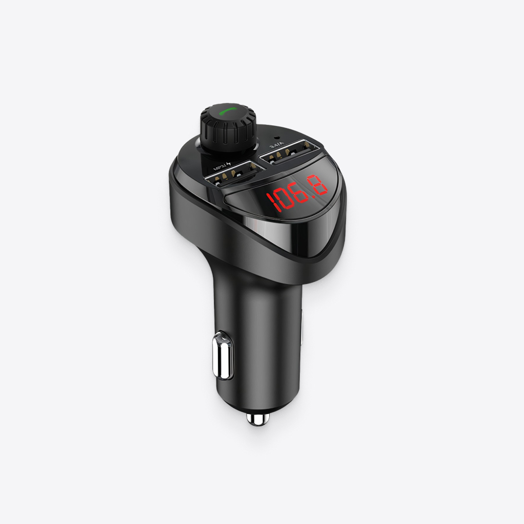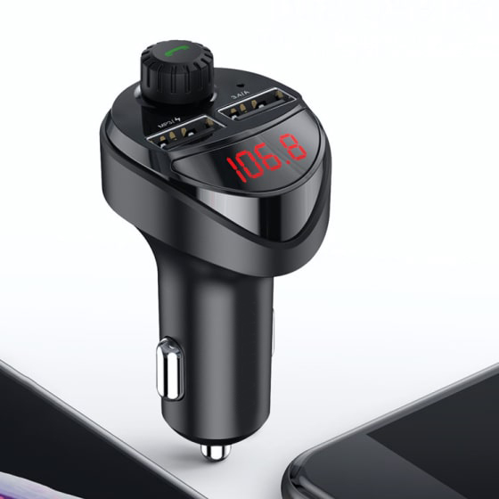 A large red LED digital readout displays the current FM frequency for easy-to-read radio station searching, while a built-in mic can broadcast navigation directions from your phone.
