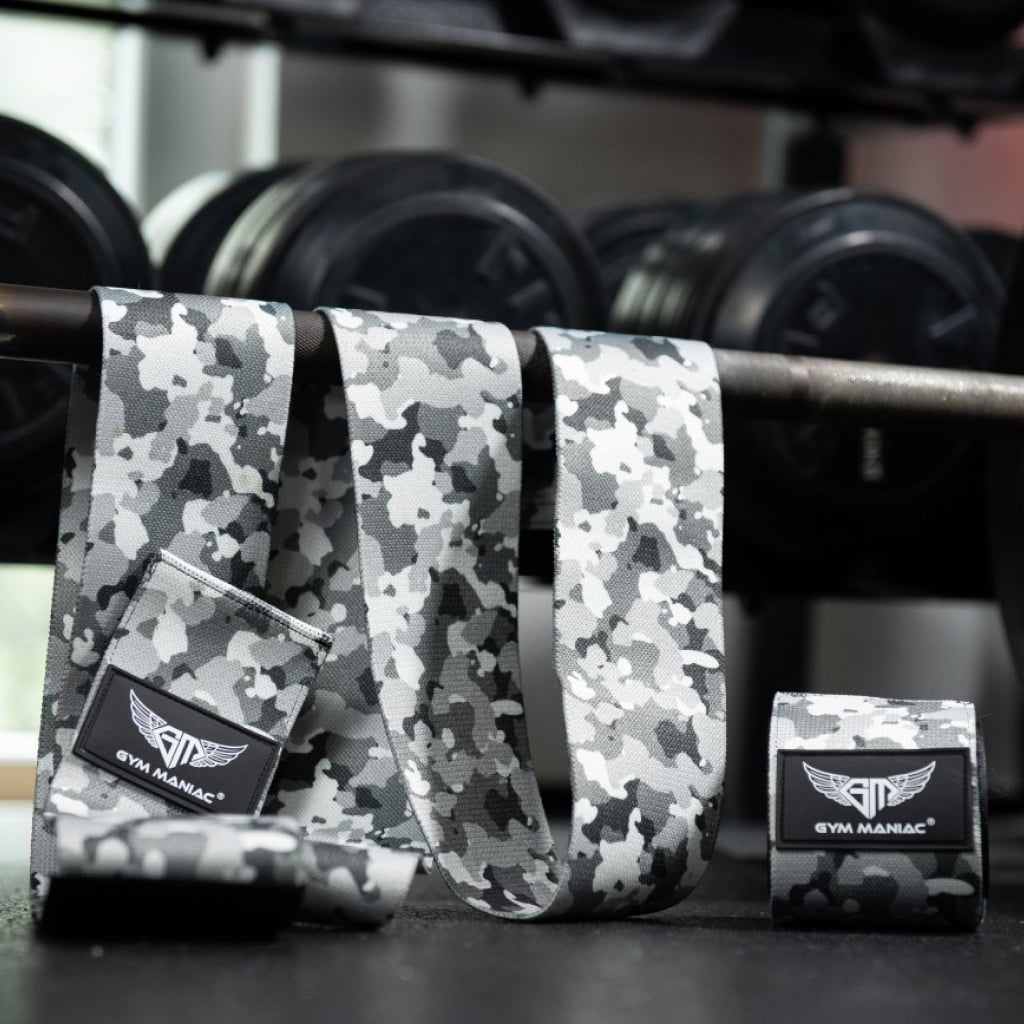 Our Gym Maniac Light Gray Camo GM Support Compression Knee Wraps are stylish and designed for men and women and gym-goers of all ages and sizes.