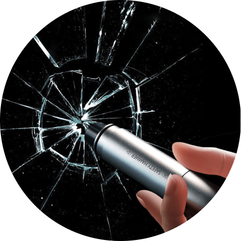 A tungsten-steel head on one end acts as a glassbreak hammer to shatter away car windows or windshield glass; a concealed stainless-steel blade on the other end helps slice away at seatbelts.