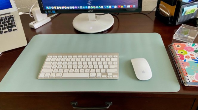 It’s perfect for my Apple wireless keyboard and mouse. It protects the main work area of my desk while not interfering with my laptop/external monitor arrangement and other desktop items. The colors are even better than I had expected. the orange is more of a soft peach color, and the green is a silvery sage color. The pad arrived rolled with tissue paper in a sturdy box with an enclosed silica packet. Love this product!
