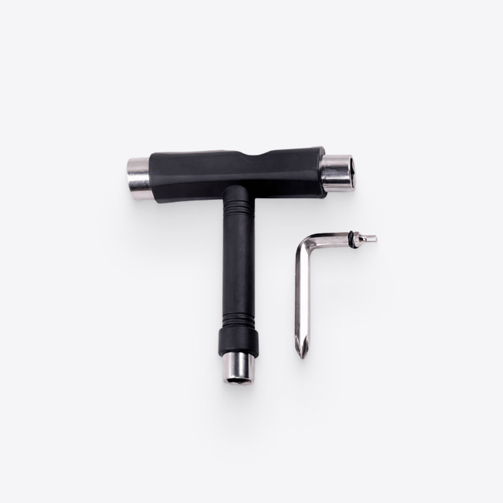 A T-tool is a universal tool that can be used to tighten up or repair your skateboard, longboard, and even a bike. The Phillips head on the top is for screws on the deck, the 1/2” socket (left) is for wheel nuts, the 9/16” socket (right) is for truck nuts, the 3/8” socket on the bottom is for hardware. Complete your skateboard assembly with just one tool!